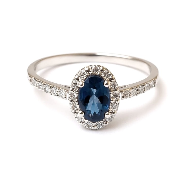Дамски пръстен със сапфир и диаманти от бяло злато 14 карата